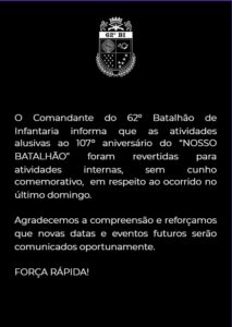 Sem a presença de público externo, apenas dos Ex-Cmts e familiares, do Gen Calderaro – Cmt da 14ª Brigada, Cmt do 23ºBI, da 5a RPM, Cmt do 17a BPM, alguns ex-integrantes do 62ºBI.