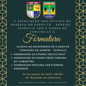 Nobres Associados, nesta data participamos da Formatura alusiva aos 9 anos de fundação da AORESC-Joinville, e após a Formatura, na Sede da AORE foram homenageados, Ten R2 Waldir Marcos Fruit (in memorian), e também o Sgt Sebastião Ex-Combatente da FEB – Sócio Benemérito, na ocasião também foi descerrada a placas em homenagem aos Nobres associados que fizeram parte do quadro de Associados e que hoje não mais estão em nosso plano.