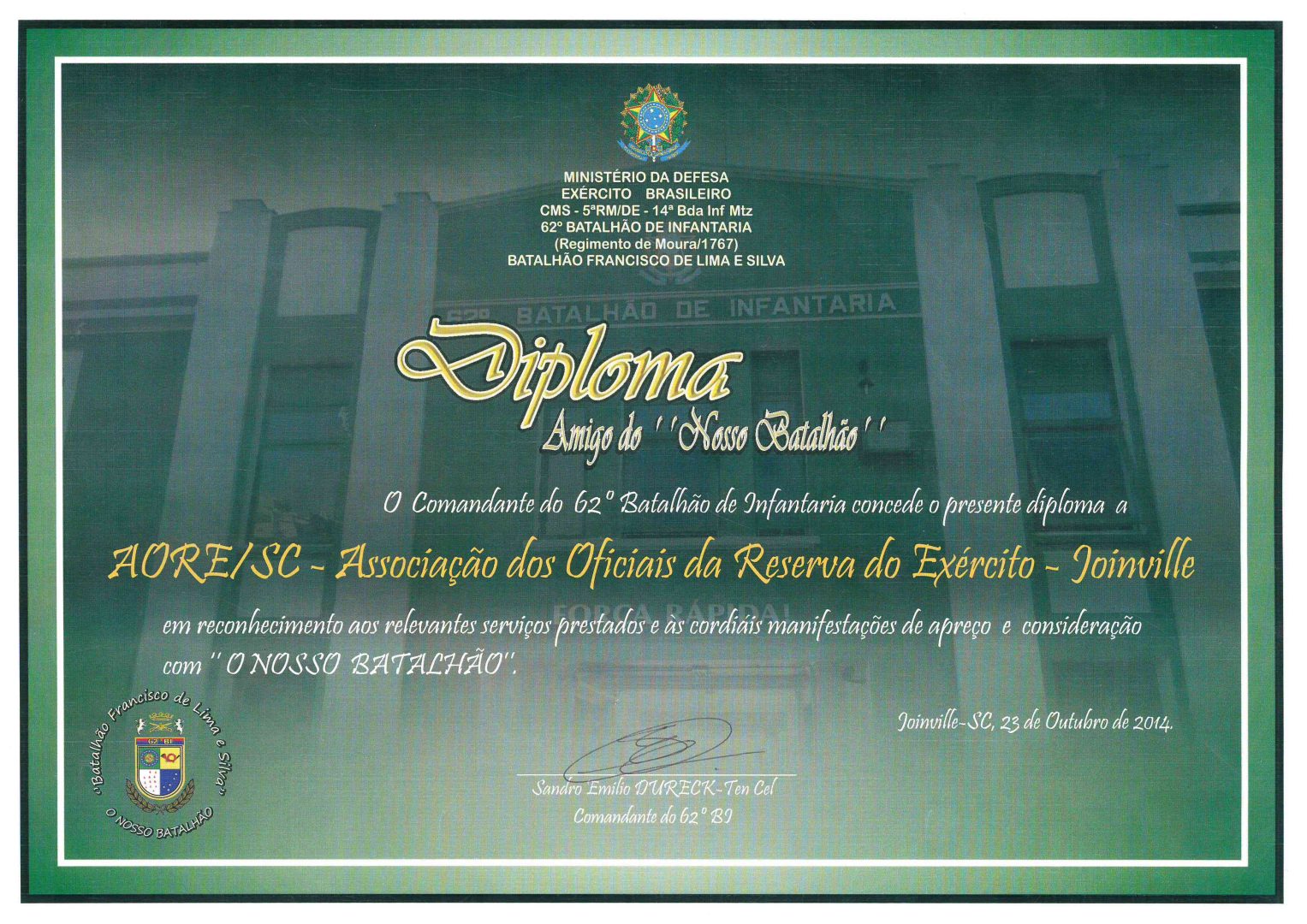 AORESC Joinville – Amigo do Batalhão – 23/Outubro/201423 de outubro de 2014Obras da AORE SC – Joinville – 2015 e 201612 de janeiro de 2015 Solenidade Militar do Aspirantado – 2014 ->Data: 29 Nov 2014 Fotos: Imagens do evento