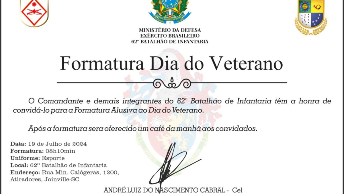 Em 19 de julho, a AORE-SC esteve presente no 62º Batalhão de Infantaria, participando da formatura em homenagem ao Dia do Veterano. Durante o evento, os Aoreanos e demais veteranos tiveram a oportunidade de desfilar e reviver momentos históricos de suas jornadas na caserna.