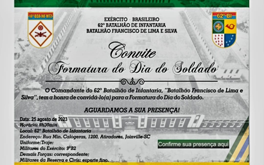 Com a presença do Presidente Ten R2 Jackson, Ten R2 Vitorio, Ten R2 Mario Celso e Ten R2 Meyer, representaram a AORESC-Joinville, na Formatura e Solenidade pelo Dia do Soldado no 62BI.