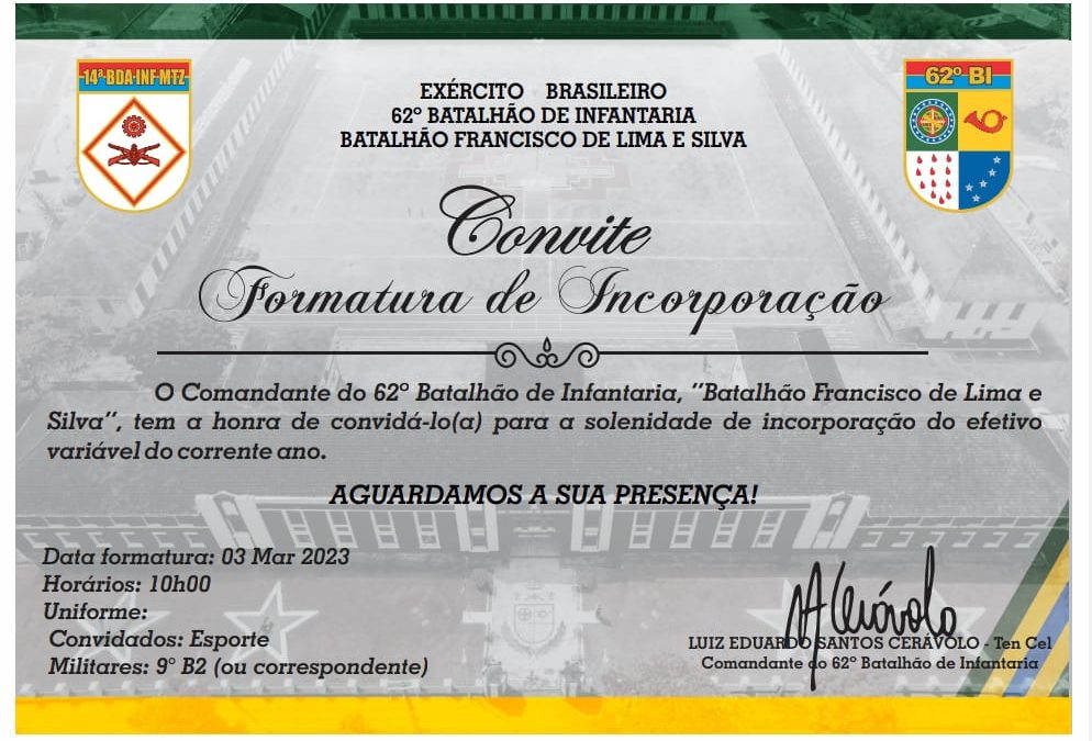 REUNIÃO GERAL AORE-SC – 27/Fevereiro/202327 de fevereiro de 2023Incorporação dos Alunos da Escola Cívico Militar – 07/Março/20237 de março de 2023 SOLENIDADE DE INCORPORAÇÃO DO EFETIVO VARIÁVEL-2023 ->Data: 03 Mar 2023 Imagens do evento