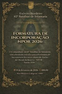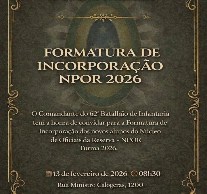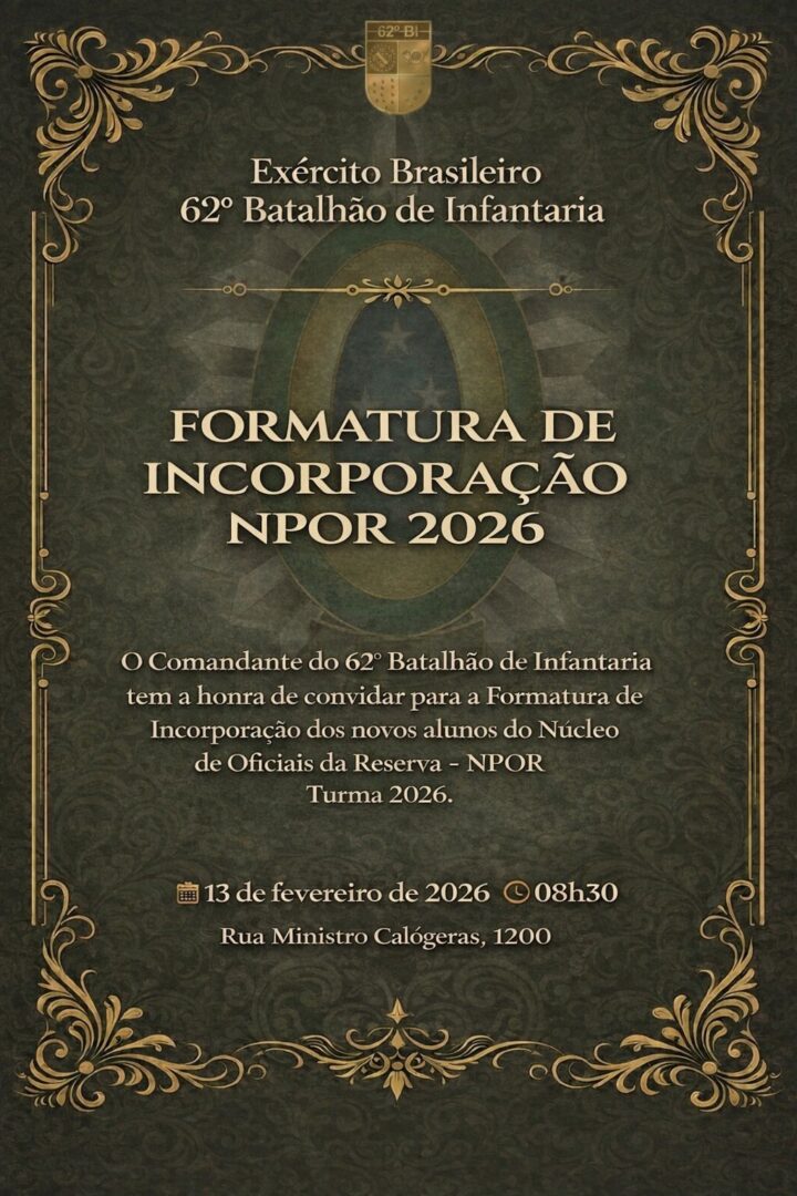 O Comandante do 62º Batalhão de Infantaria, TC Guilherme Esteves Modesto, tem a honra de convidar a AORE/SC, para a Solenidade de entrada e Aula Inaugural do Núcleo de Preparação de Oficiais da Reserva – NPOR do 62ºBI – Turma 2026.